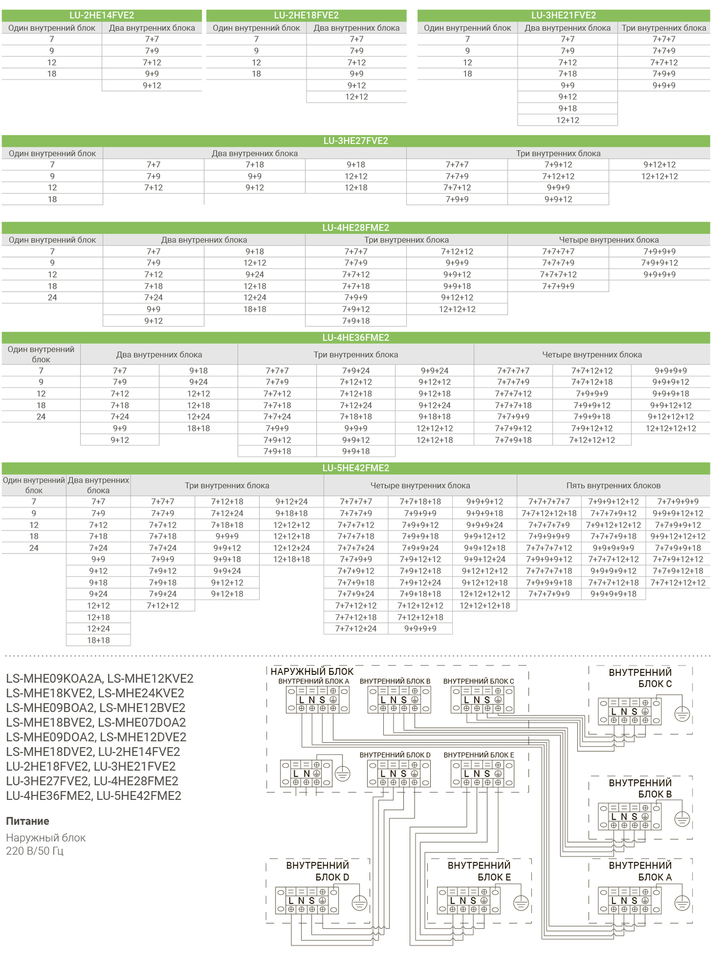Общая площадь охлаждения до 40 кв.м, комбинации внутренних блоков подбираются индивидуально.