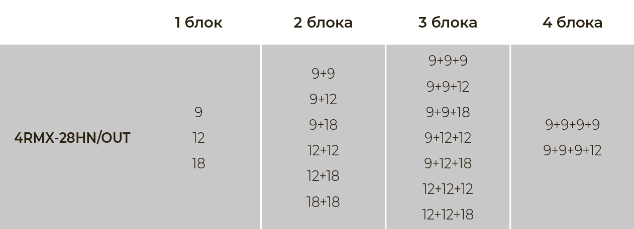 Общая площадь охлаждения до 80 кв.м, комбинации внутренних блоков подбираются индивидуально.