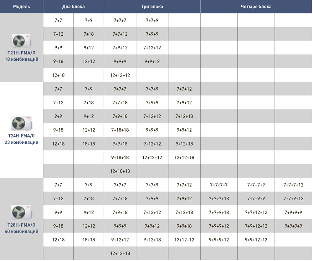 Общая площадь охлаждения до 60 кв.м, комбинации внутренних блоков подбираются индивидуально.