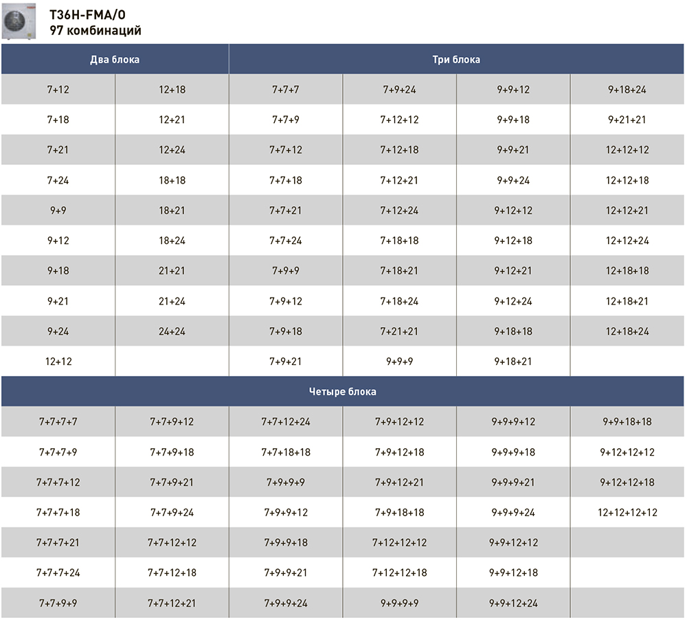 Общая площадь охлаждения до 100 кв.м, комбинации внутренних блоков подбираются индивидуально.