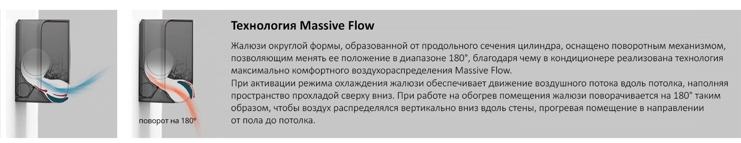- Технология Massive Flow — особенная округлая форма жалюзи направляет воздух вертикально вдоль стены к полу, когда помещение нужно обогреть. А в случае, когда требуется охладить — поворачивается на 180°, рассеивая холодный воздух от потолка к полу.