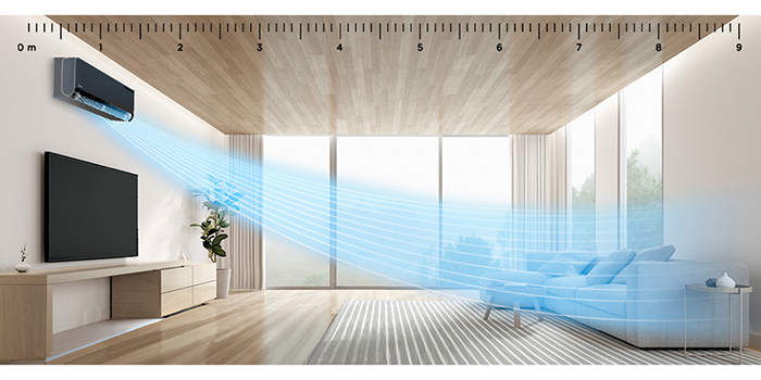 - Протяженный воздушный поток — специальная усовершенствованная форма вентилятора и особенные круглые жалюзи создают мощный протяженный поток воздуха длиной до 9 метров. Такая особенность позволяет эффективно охлаждать помещения вытянутой формы.