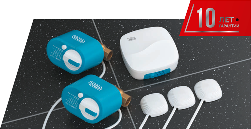 • Полный комплект для защиты. В коробке есть всё необходимое: модуль управления, 2 крана с приводом 12В, 3 датчика протечки с соединительными кабелями и терминатор для контроля линии.