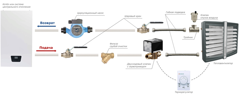Тепловентилятор подключатся к источнику горячего водоснабжения или отопления с помощью гибкой подводки. Принцип работы основан на протекании горячей воды через теплообменник, который отдает тепло струе нагнетаемого воздуха. Монтаж может быть настенным или подпотолочным, крепится на монтажную консоль (консоль приобретается отдельно). Управление тепловентилятором осуществляется через пульт Sonniger COMFORT