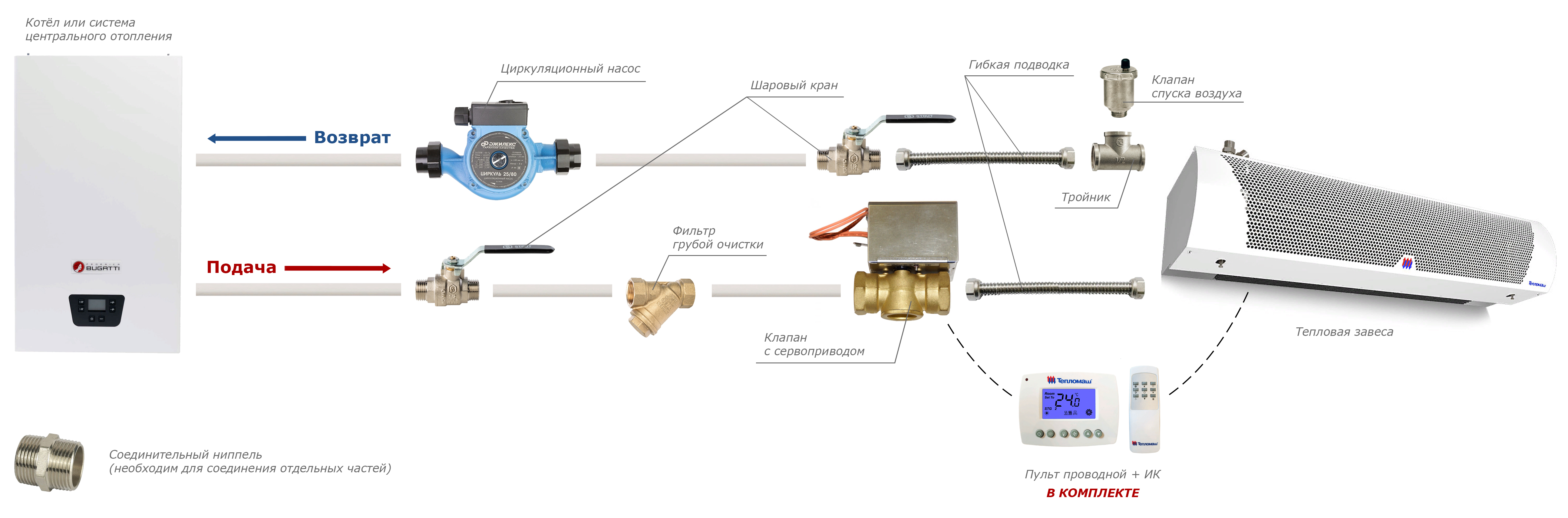 - Стандартная комплектация: завеса + проводной пульт HL10 с электронным термостатом — поддержание заданной температуры осуществляется за счет включения/выключения вентилятора и его работы на выбранной скорости. При достижении необходимого уровня температуры вентилятор завесы отключается, теплоноситель продолжает циркулировать.