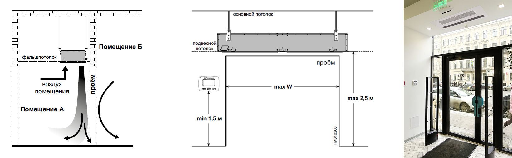 Встраивается в подвесной или фальш-потолок над дверным проёмом, на высоте не более 2,5 м. Благодаря такой установке завеса выглядит эстетично, не портит общий вид.